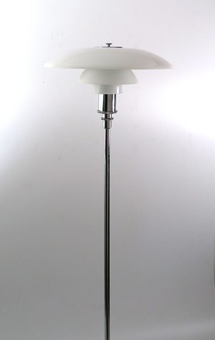 Poul Henningsen (1894-1967) PH 3½-2½ gulvlampe med fodstykke og stamme samt fatningshus og top af højglans forkromet messing, skærme af mundblæst hvidt opaline glas. Overskærm diameter 33 cm., H. 132 cm. Fremstillet hos Louis Poulsen.