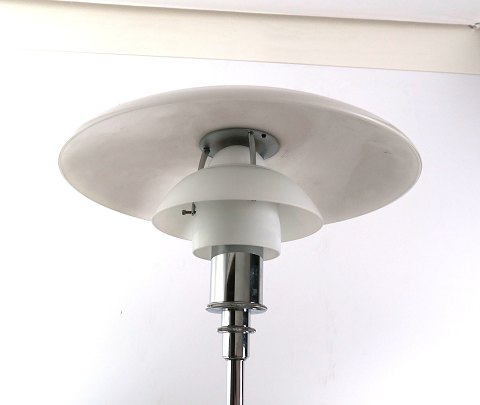 Poul Henningsen (1894-1967) PH 3½-2½ gulvlampe med fodstykke og stamme samt fatningshus og top af højglans forkromet messing, skærme af mundblæst hvidt opaline glas. Overskærm diameter 33 cm., H. 132 cm. Fremstillet hos Louis Poulsen.