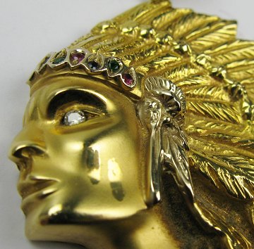 Italiensk design vedhæng af 18 kt. guld i form af indianer "chief head", prydet med brillantsleben diamant, 3 facetslebne rubiner, 2 smaragder og 2 safirer. L. med sikerhedslukke ca. 65 mm. Finguldindhold ca. 22,5 gr. - Vægt 29,35 gr.