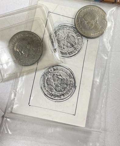 Desuden 2 stk 10 kr 1986 samt æske med 16 diverse mønter, samt emaljeret sølvnål fra Frederiksborg Amts Sygehuse med sikkerhedslås