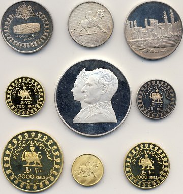Iran, 2000 - 1000 - 750 og 500 Rials 1971 i GULD samt 25 - 50 - 75 - 100 og 200 Rials i sølv 1971, komplet sæt i original æske. Til minde om 2500 året for det iranske dynasti.
