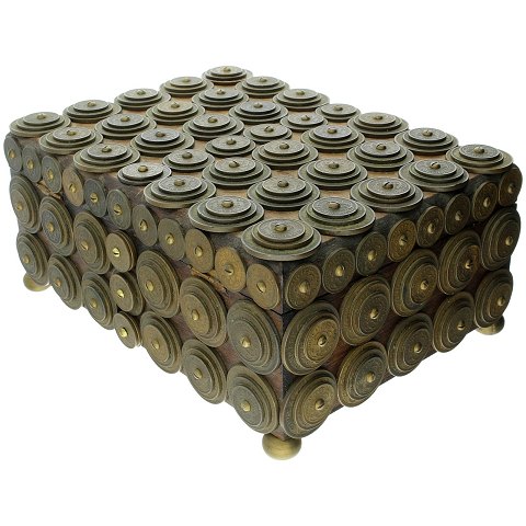 Æske af træ, besat med talrige danske kobbermønter af typen 1926-40