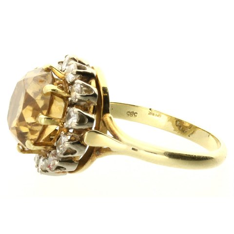 Ring af guld 14kt. fattet med stor røgfarvet topaz og 12 brillanter ialt ca. 0,96ct.