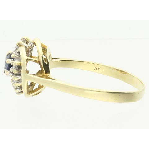 Ring af guld 14kt. fattet med safir og brillanter ialt ca. 0,12ct.