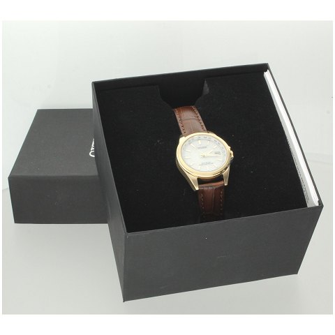 Uret har en 29mm kasse af rosaforgyldt stål, kassen er monteret på en brun kalveskindsrem afsluttet med c-spænde, ligeledes udført i rosaforgyldt stål. Uret har en hvid skive med stregindeks og datovindue. Uret er udstyret med et Citizen Eco-Drive quartz-værk som har funktioner så som verdenstid og er radiostyret.
