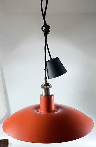 Poul Henningsen PH 4/3 pendel med skærme af orangelakeret aluminium, sort stofledning, uoriginalt fatningshus fatningshus af pantineret messing, uoriginal sort baldakin. Lanceret i 1966 og fremstillet hos Louis Poulsen. Diam. ca. 40 cm.