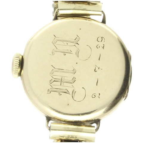 Uret har en 21,5mm kasse af guld 14kt. kassen er monteret på en fixoflex lænke af forgyldt stål. Uret har en patineret skive med svagt regnbue-skær og arabertal. Uret er udstyret med et mekanisk værk med manuelt optræk.