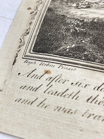 Stor (31*20 cm) radering af den berømte italienske kunstner Raffaello Sanzio da Urbino. Graveret af kunstneren Hall. Trykt omkring 1789. Papir har vandmærker.