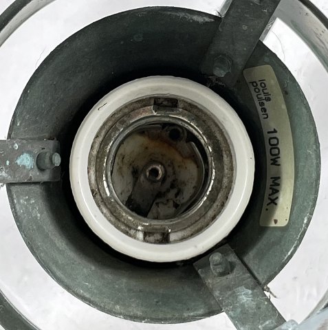 Med skærme af oxideret kobber, brugstegn, fremstillet hos Louis Poulsen. Diam 45 cm.
