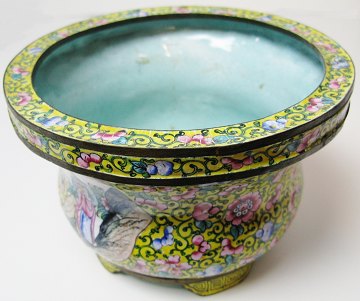 Gammel japansk skjuler af fajance med forstærkninger af metal, pragtfuldt dekoreret med personer i en have samt omløbende, sirlig ornamentik. H. ca. 12 cm., Diam. ca. 17 cm. 20. årh. begyndelse.