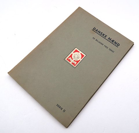 Samlermappe med 50 stk. billedemærker med portrætter af danske mænd, opklæbt på kort med tekst. Mappen indeholder 8 kuverter med påtrykte navne. Mappe 20 x 29 cm.