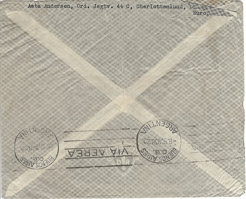 1938 - Brev fra Charlottenlund, Danmark til Buenos Aires, Argentina - 580 øre luftpost