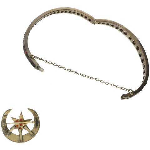 Granat armring af forgyldt metal samt granat broche i form af halvmåne med stjerne.