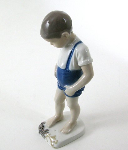 B&G figur i form af dreng, som betragter en nærgående krabbe ved en strandbred. H. 19,5 cm., 1. sortering.