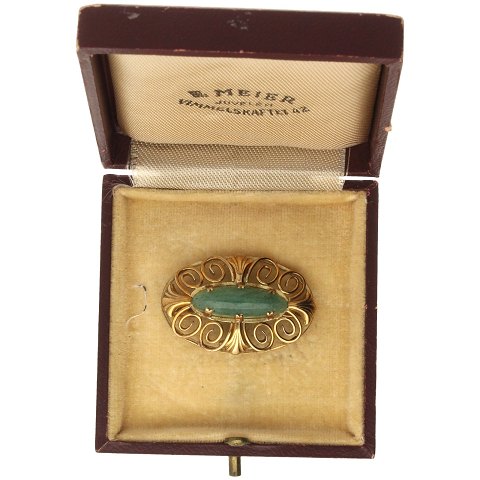 Th. Frederiksen - art nouveau broche af guld 14kt fattet med grøn sten.