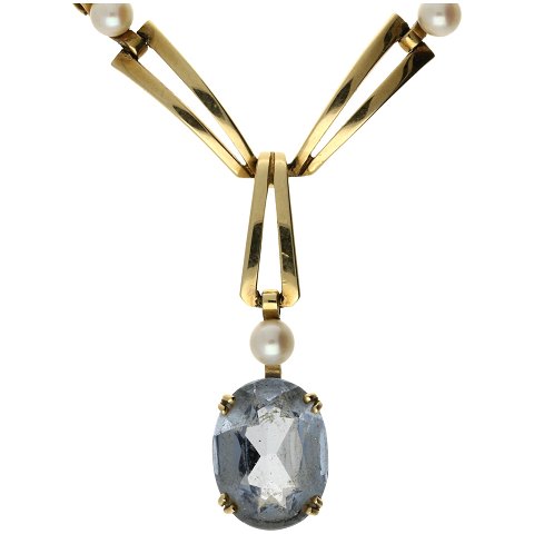 Halskæde af guld 14kt. fattet med lys blå sten og kulturperler