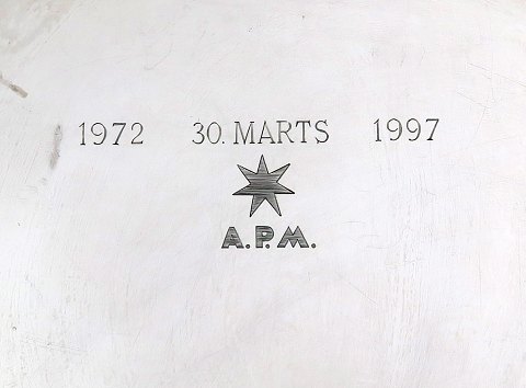 Georg Jensen, Harald Nielsen design, dessin 600 dækketallerken af sterling sølv. A.P. Møller Mærsk, 25 års jubilæumsgave 1972 - 1997. Diameter 28 cm., vægt. ca. 620 gr.