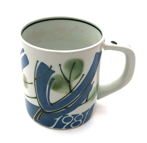 Royal Copenhagen, det store fajance årskrus 1981 med ilagt Just Andersen medaljon af sterling sølv. H. 12 cm., design Ellen Malmer