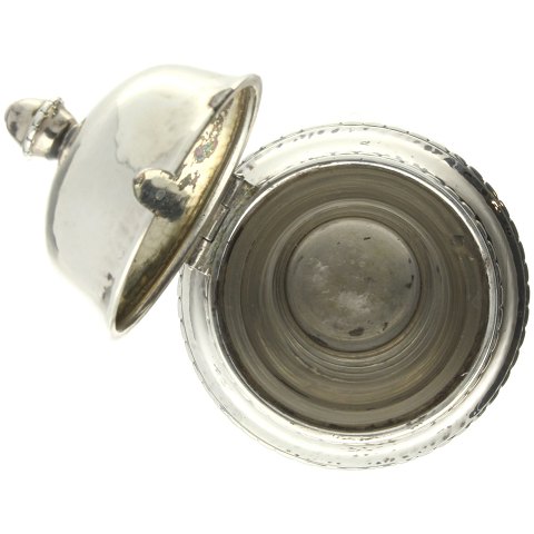 Sennepskrukke af sølv med indsats af glas og ske af andet mønster(2)