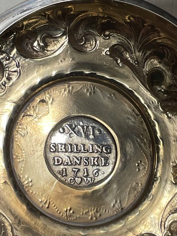 Dansk lågkrus af sølv, låg indlagt med dansk sølvmønt, Frederik IV 16 skilling 1718, indvendig forgyldt. Udført hos Viggo Hansen, Hørve (1949-1973), stempler ViH. H. 15 cm.
