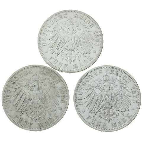 Tyskland - Preussen - Wilhelm II - 5 mark 1893/94/95 - A - sølv - 3 stk