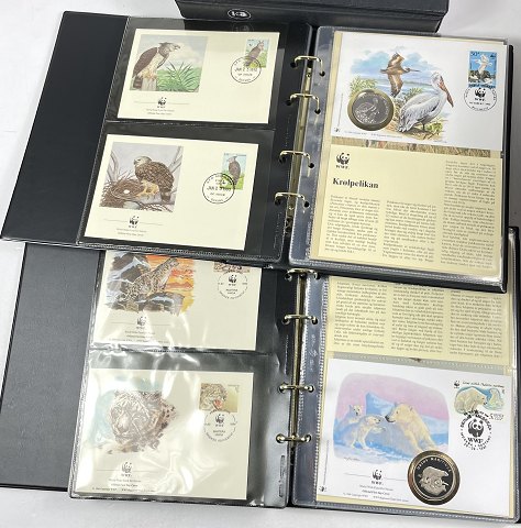 Verdensnaturfondens frimærkesamling - 3 album - fyldt med kuverter samt få mønter