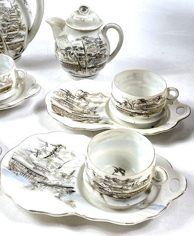 Japansk thestel af porcelæn fra 1960-70'erne, dekoreret med landskabsdekoration, bestående af en tekande, sukker og flødesæt, 6 kaffekopper og underkopper.