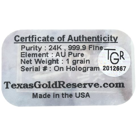 En grain guldbarre (64,8 milligram) fra Texas Gold Reserve.