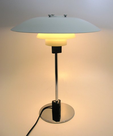 PH 4/3 bordlampe med hvid, vådlakeret overskærm, stamme og fod af forkromet metal. Overskærm diameter 44 cm., H. 57 cm.
