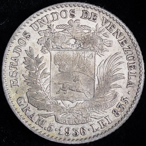 Venezuela - 1 Bolívar - 1936 - Sølv - Y#22