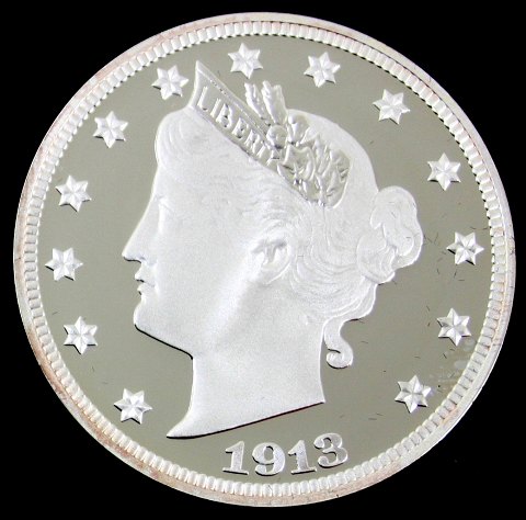 Kopi af 5 cent 1913, præget i finsølv, diameter 40 mm.