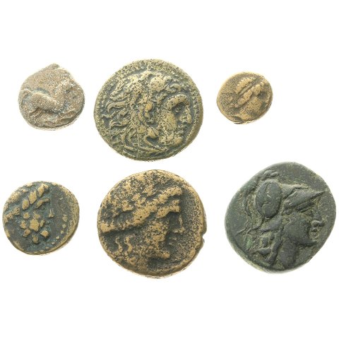 Tolv ægte bronzemønter fra den antikke græske verden, der dækker en periode på syv århundreder, og repræsenterer de kongeriger, der kæmpede mod de gamle grækere, og dem, der blev besat og "helleniseret" af Alexander den Stores hære.