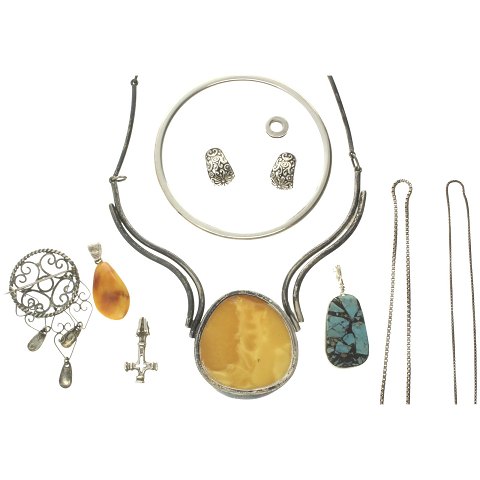 1 armring - 1 broche - 3 vedhæng - par ørestikker - 1 charm - 2 halskæder - 1 halssmykke med stort stykke rav.