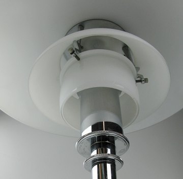 Poul Henningsen (1894-1967) PH 3/2 bordlampe af højglansforkromet messing, skærme af mundblæst hvidt opalineglas, H. 47,2 cm. Overskærm Diam. 29 cm.