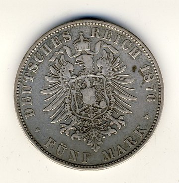 Tyskland - Sachsen - 5 mark 1876 - E - sølv - J.122