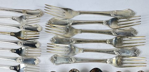 1 saltske - 12 kaffe/teskeer - 3 dessertskeer - 1 frokostske - 11 middagsskeer - 3 suppeskeer - 1 marmeladeske - 2 serveringsskeer - 8 kagegafler - 13 frokostgafler - 9 middagsgafler - 1 stegegaffel - 10 middagsknive - 1 lagkagekniv.