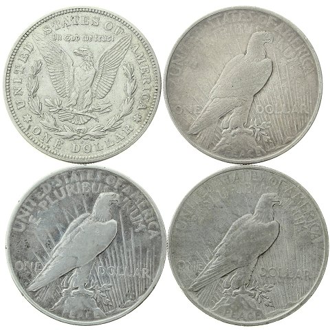 Lot, USA - 1 Dollar "Morgan Dollar", 3x 1 Dollar "Peace Dollar" - 1921, 1922, 2x 1923 - Sølv - KM# 110, KM# 150