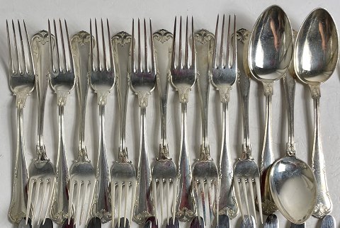 12 spisegafler - 3 spiseskeer - 3 frokostgafler - 3 frokostknive - 14 middagsknive.