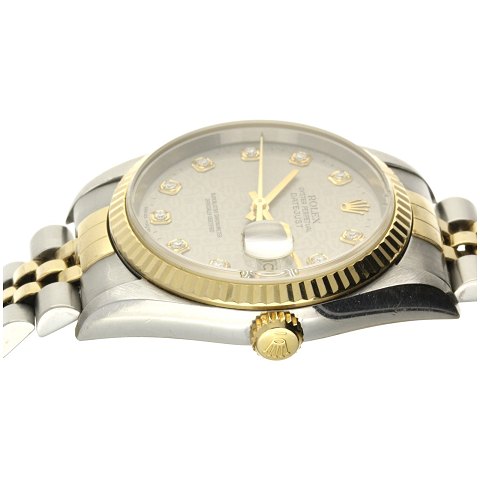 Uret har en 36mm kasse af stål, kassen er monteret på en jubilee lænke, udført i stål og guld 18kt. Uret har en flot grå "jubilee diamond" skive med diamant-besatte punktindeks og datovindue. Uret er udstyret med et Rolex Cal. 3135 som er et mekanisk værk med automatisk optræk.