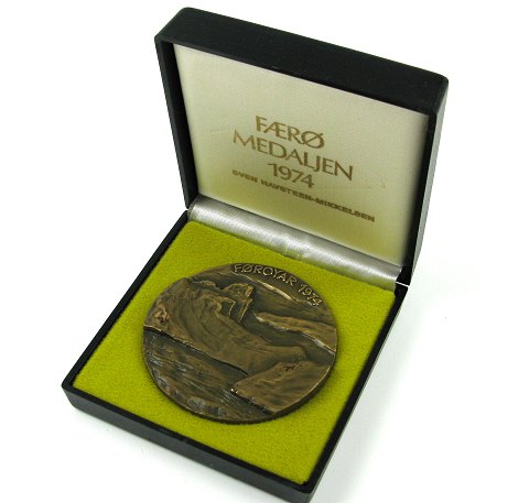 Færømedaille af bronze, årgang 1974, designet af Sven Havsteen-Mikkelsen. Diam. 70 mm., vægt ca. 270 gr.