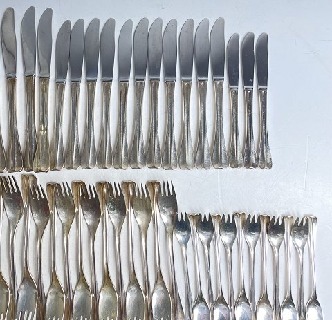 12 middagsknive - 11 frokostknive - 3 bordknive - 12 middagsgafler - 11 frokostgafler - 12 kagegafler - 12 middagsskeer - 12 teskeer - 1 kødgaffel - 1 forskærerkniv - 1 kagekniv - 1 ostehøvl - 2 mellemstore serveringsskeer - 1 stor serveringsspade - 1 sovseske - 1 serveringsgaffel - 2 små serveringsspader - 3 sildegafler - 3 små serveringsskeer - 1 oplukker.
