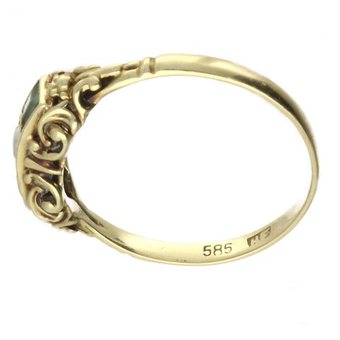 Ring af guld 14kt. fattet med grønne sten og perle.