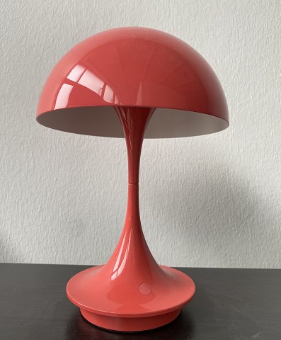 Verner Panton for Louis Poulsen - Panthella portable bordlampe, model V2 udført af coral / orangelakeret metal. H. 23,2 cm. Ø. 16 cm. Lampen blev lanceret i 2021 for at fejre 50-årsdagen for designet af den ikoniske Panthella-model. Lampen oplades via. en USB-port. Strøm: USB-kabel til standard USB-adapter. Bemærk: denne medfølger ikke. Udstillingsmodel direkte fra butik, aldrig brugt. Vejl. udsalgspris: 2.295 kr.
