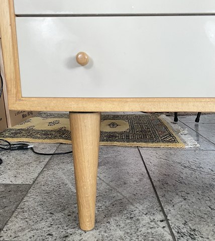HG Furniture - Høj kommode af fineret egetræ, front med tyve skuffer med greb af egetræ, runde tilspidsede ben af massivt egetræ. Fremstillet hos HG Furniture, brandmærke herfra. H. 121,5 B. 101 D. 36 cm. Fremstår i pæn stand, dog enkelt finerafslag.