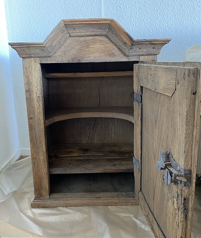 Tobaksskab af egetræ, front med profileret låge bag hvilke hylder. 1800-tallet. Nøgle medfølger.