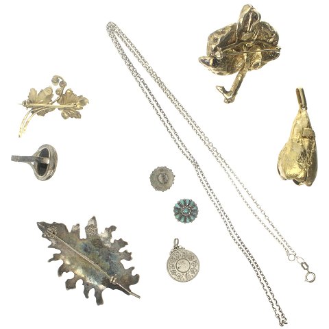 3 brocher - 1 ring - 2 vedhæng - et par ørestikker - en halskæde, 70cm.