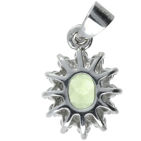 Vedhæng udført af 14 kt. hvidguld prydet med centreret peridot omkredset af klare sten. Vægt: ca. 1,60 gram. Certifikat fra Wang Talang Gems International medfølger.