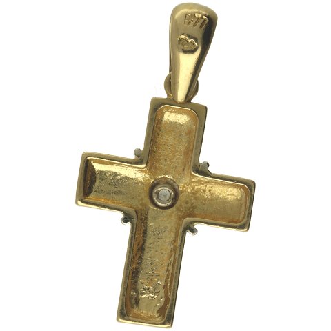 Vedhæng i form af kors udført af 18 kt. guld prydet med lille diamant på ca. 0.02 ct. Vægt: ca. 1,87 gram.