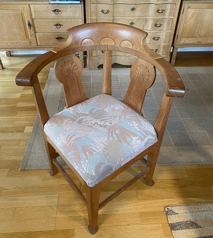 Fire hjørnestole / kaptajnstole med stel af massivt egetræ med udskæringer, sæder betrukket med mønstret møbelstof. Sh. ca. 47 cm.