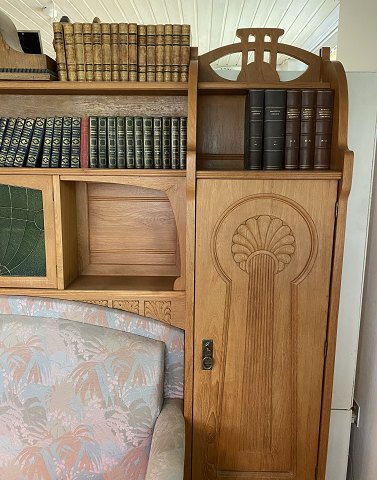 Tre-delt reolsystem af massivt egetræ med udskæringer. Midterste modul med indbygget sofa betrukket med blomstret møbelstof samt indbygget ur. Sh. ca. 46,5 cm.